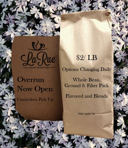 At LaRue Coffee & Roasterie, there is freshly roasted coffee daily. At the end of a coffee run, there is excess coffee that is not enough to package as normal. Instead of letting this excess go to waste, we help people get a good cup of coffee by offering this over-run coffee at a discounted price to the public.